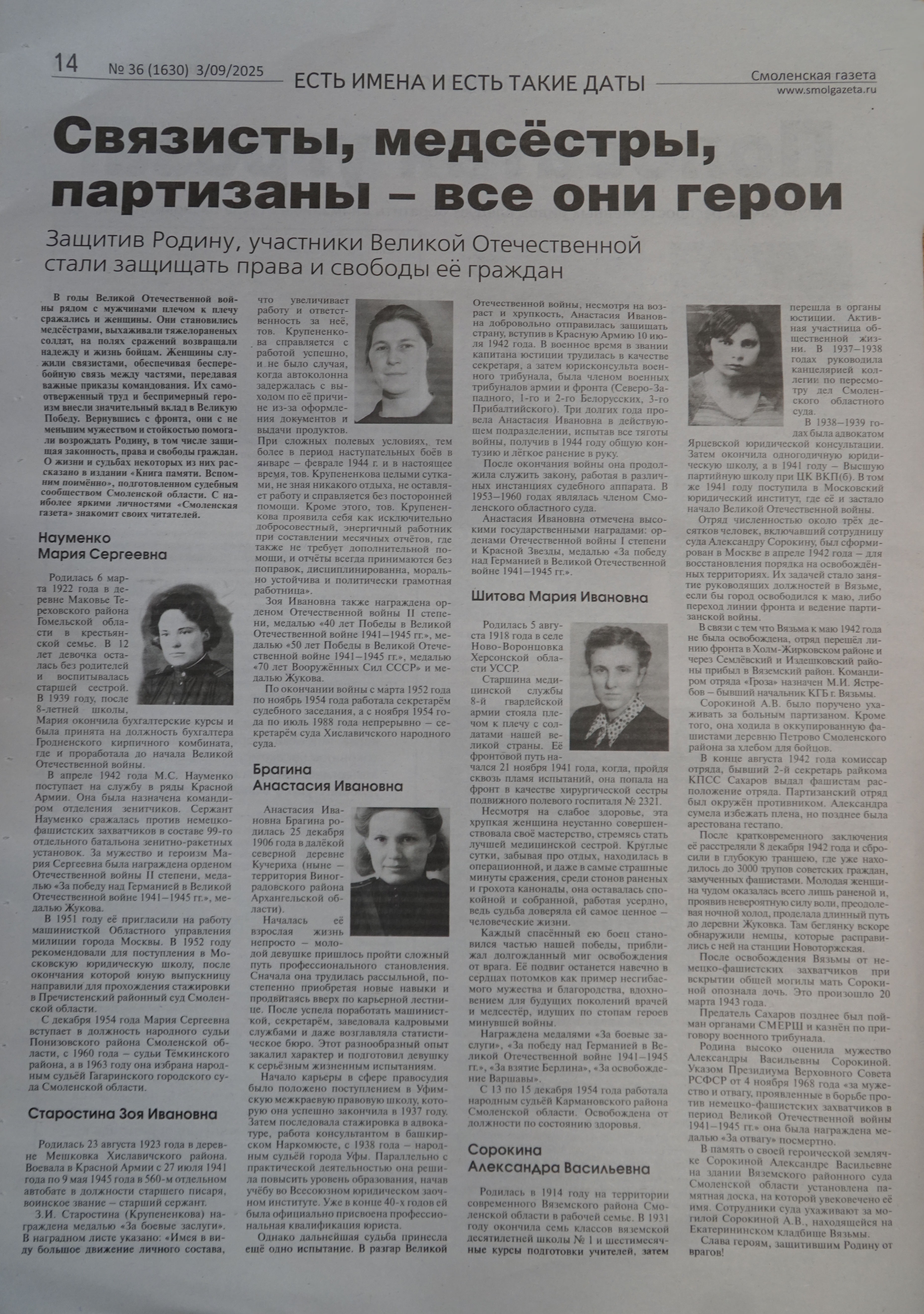 В «Смоленской газете» № 36 от 3 сентября 2025 года вышла четвертая статья серии публикаций о ветеранах Великой Отечественной войны, работавших в судебной системе нашего региона. На этот раз мы решили уделить внимание подвигам женщин, чьи истории часто остаются вне поля зрения широкой общественности. Рассказывая о примерах мужества и стойкости наших соотечественниц, проявивших себя на полях сражений, в госпиталях и трудовых коллективах, мы хотели подчеркнуть значимость вклада женщин в общее дело Победы.