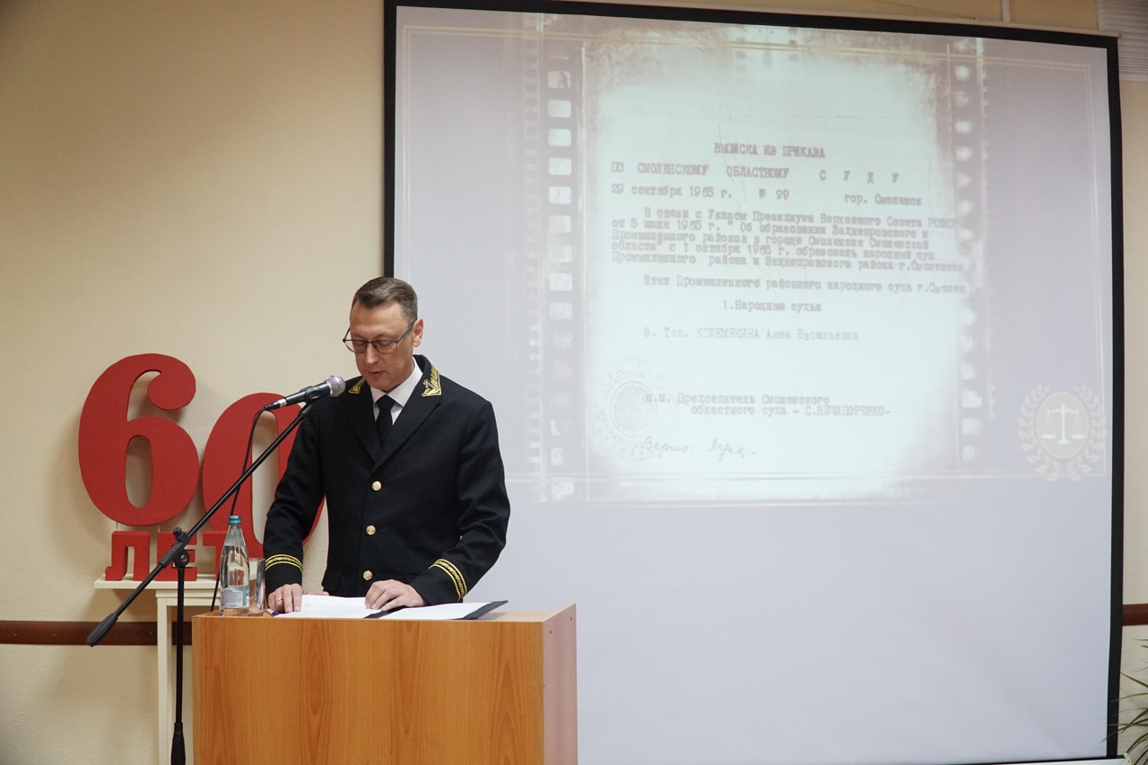 Во исполнение Указа Президиума Верховного Совета РСФСР от 5 июля 1965 г. «Об образовании Заднепровского и Промышленного районов в городе Смоленске Смоленской области» с 1 октября 1965 г. образован народный суд Промышленного района г. Смоленска. 1 октября 2025 г. состоялось торжественное совещание, приуроченное к 60-летию со дня образования Промышленного районного суда г. Смоленска, на котором присутствовали почетные гости: председатель Смоленского областного суда Евгений Александрович Шепелин, заместитель председателя Смоленского областного суда по гражданским и административным делам, председатель Совета судей Смоленской области Антон Сергеевич Киселёв, начальник Управления Судебного департамента в Смоленской области Дмитрий Викторович Шутов, исполняющий обязанности прокурора Промышленного района г. Смоленска Василий Сергеевич Сударенков, руководитель Ленинского межрайонного следственного отдела г. Смоленска – подполковник юстиции Андрей Вячеславович Кудинов, председатель Промышленного районного суда г. Смоленска в период с 2001 года по 2007 год – заместитель председателя Смоленского областного суда в почетной отставке Александр Федорович Струженков, председатель Промышленного районного суда г. Смоленска в период с 2008 года по 2014 год в почетной отставке Андрей Александрович Шерин, специальный корреспондент ГТРК «Смоленск» Екатерина Александровна Левицкая.
