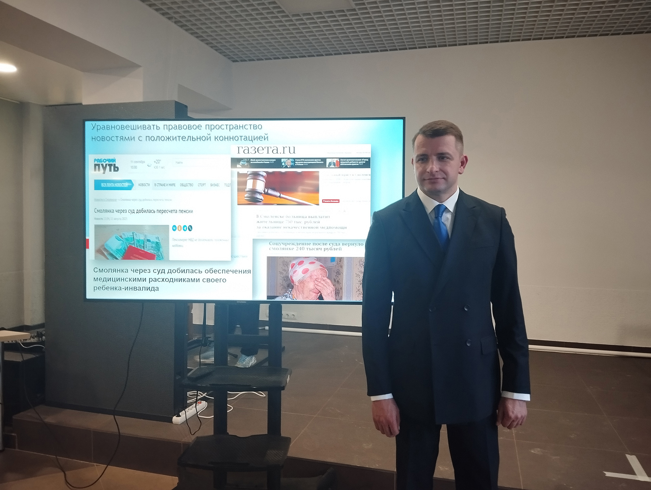 Средства массовой информации способствуют открытости правосудия, формируя доверие к судебной системе. Совместная работа с прессой помогает не только освещать громкие судебные процессы, но и противодействовать фейкам, препятствовать так называемой «скандализации правосудия». Именно поэтому судейское сообщество региона решило провести встречу в формате лекции, чтобы поделиться профессиональными советами с будущими журналистами. Встреча состоялась на базе СмолГУ со студентами 1-2 курсов филологического факультета направления «Журналистика». Главной ее целью было познакомить слушателей с особенностями освещения в СМИ правовой жизни общества. Со вступительным словом выступил председатель Смоленского районного суда Смоленской области, председатель комиссии Совета судей Смоленской области по связям с государственными органами, общественными организациями и средствами массовой информации, к.ю.н. Капустин О.А. Он отметил, что судебная тема сегодня востребована, потому что всегда привлекала, привлекает и будет привлекать внимание массовой аудитории, поскольку касается жизни человека, различных рядовых либо бытовых ситуаций. Происходящее в залах судебных заседаний – интереснейший срез жизни: «Повествуя о судебных делах, невозможно обойтись без эмоциональности, использования привлекательных заголовков и ярких выразительных средств. Но при этом важно не допускать поверхностного, низкопробного, криминального репортажа. Здесь очень важен баланс информативности, достоверности и «развлекательности»».