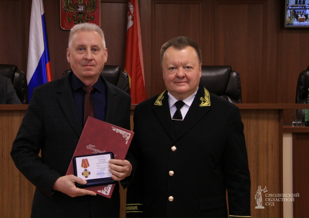 -знак отличия Судебного департамента при Верховном Суде Российской Федерации «За усердие» II степени, которым отмечена Кудимова Н.В. – начальник отдела обеспечения судопроизводства по гражданским делам Заднепровского районного суда г. Смоленска. Для последующего вручения награда передана председателю Заднепровского районного суда г. Смоленска Селезеневу В.П.