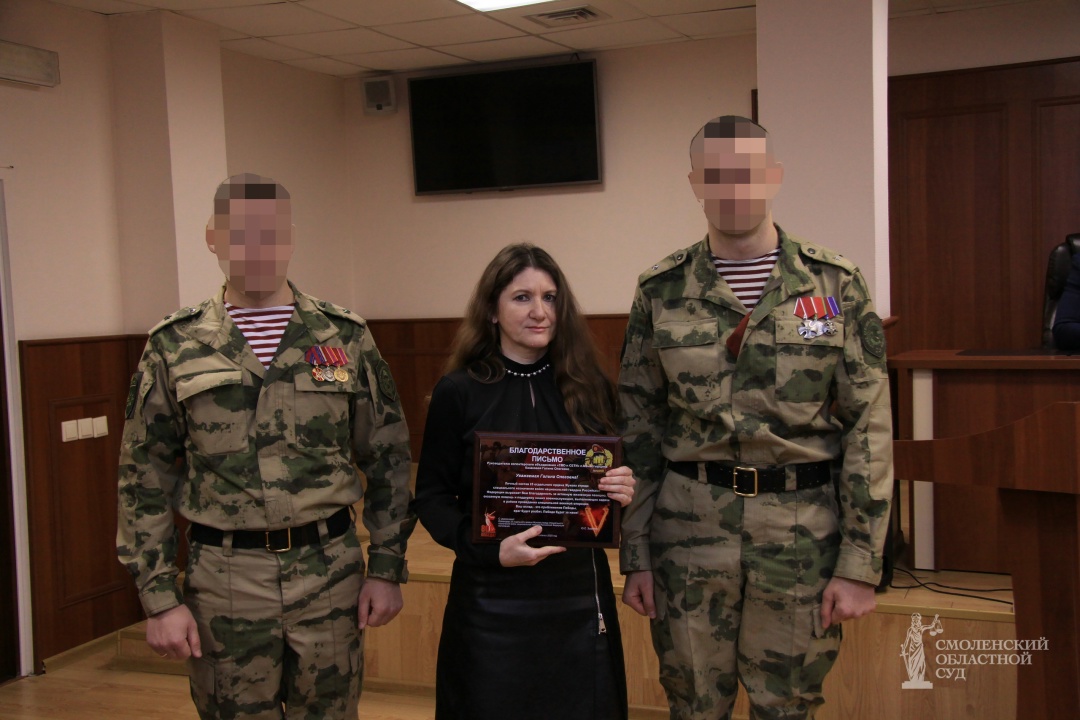 Сегодня в ходе еженедельного планерного совещания в Смоленском областном суде главному специалисту отдела по вопросам противодействия коррупции Управления Судебного департамента в Смоленской области, руководителю волонтерского объединения «СВО и СЕТИ» п. Монастырщина Казаковой Г.О. вручено Благодарственное письмо личного состава 25 отдельного ордена Жукова отряда специального назначения за активную жизненную позицию, оказанную помощь и поддержку наших военнослужащих, выполняющих задачи в районе проведения специальной военной операции.