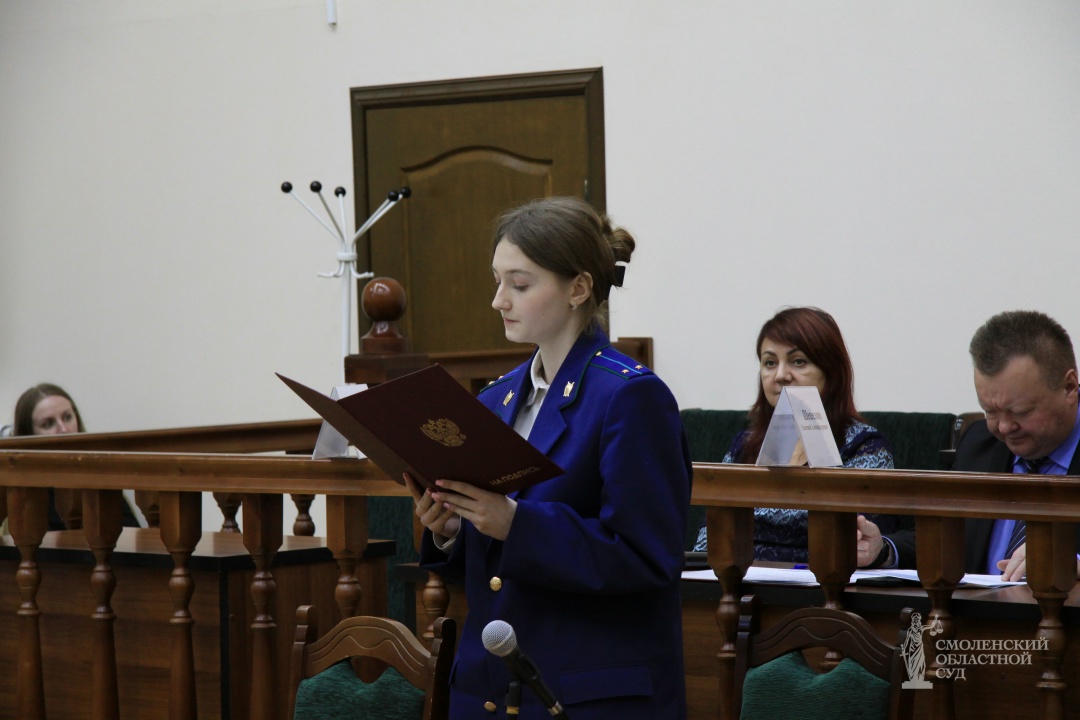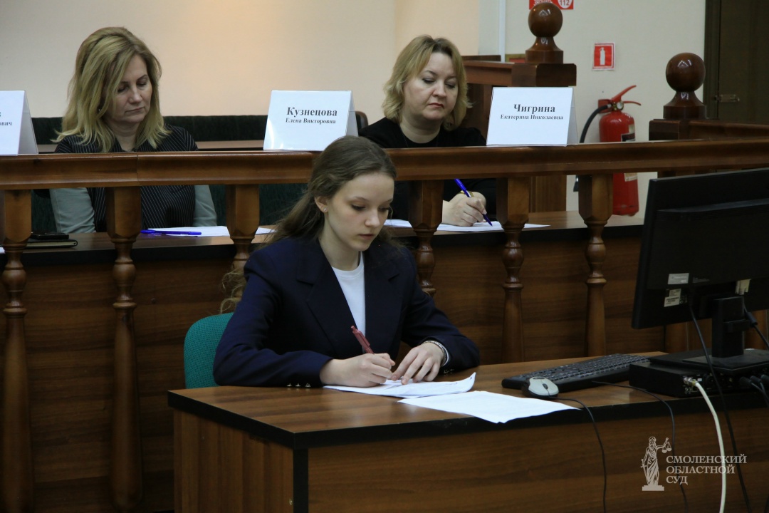 В качестве жюри принимали участие: председатель Оргкомитета – председатель Смоленского областного суда Е.А. Шепелин; заместитель председателя Оргкомитета – заместитель председателя Смоленского областного суда, председатель Совета судей Смоленской области, А.С. Киселев; члены Оргкомитета: и.о. заместителя председателя по уголовным делам Смоленского областного суда Г.Е. Кива, начальник УСД в Смоленской области Д.В. Шутов, начальник отдела дополнительного образования и профориентационной работы Министерства образования и науки Смоленской области Н.Н. Лазарева, ведущий специалист отдела дополнительного образования и профориентационной работы Министерства образования и науки Смоленской области Е.Н. Чигрина, декан факультета истории и права Смоленского государственного университета, к.ю.н., доцент Е.В. Кузнецова.