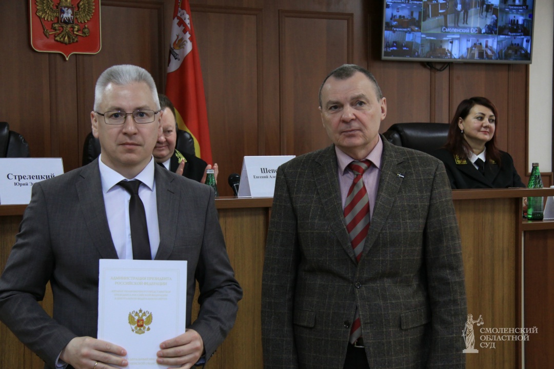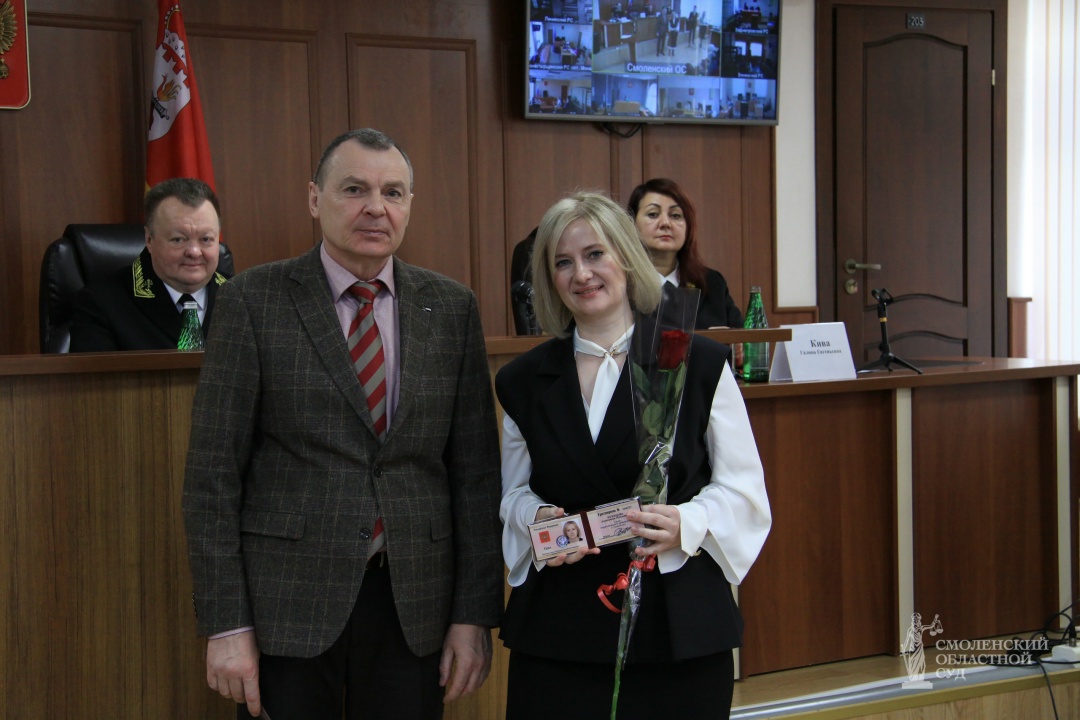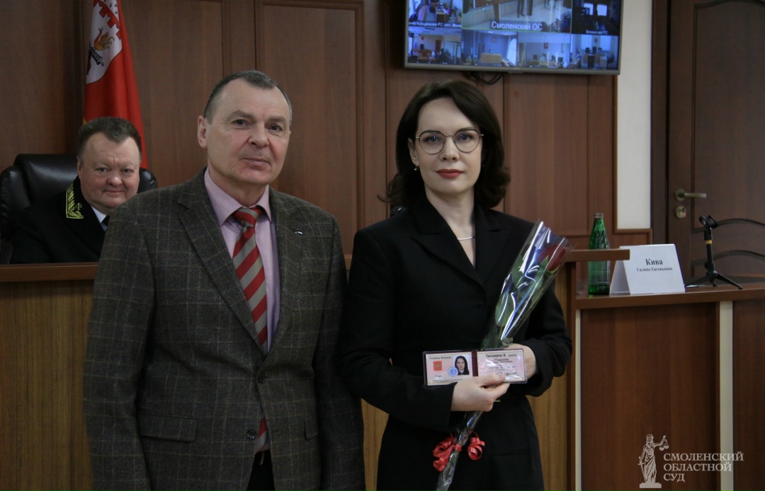 13 марта 2026 года в Смоленском областном суде в рамках совещания по итогам работы судебной системы региона за 2025 год состоялось официальное вручение служебных удостоверений. Главный федеральный инспектор по Смоленской области Юрий Стрелецкий вручил служебные удостоверения трем судьям, назначенным Указом Президента Российской Федерации от 16 февраля 2026 года № 93: судье Ельнинского районного суда – Игорю Кудрявцеву, судье Заднепровского районного суда г. Смоленска – Александре Кузнецовой и судье Ленинского районного суда г. Смоленска – Наталии Трухмановой.