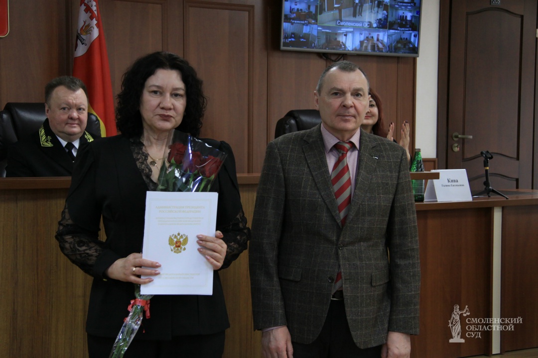 В этот же день Юрий Стрелецкий вручил региональные и федеральные награды наиболее отличившимся представителям судейского сообщества. Благодарственным письмом Губернатора Смоленской области Василия Анохина отмечен председатель президиума Совета ветеранов судейского сообщества, судья Смоленского областного суда в почетной отставке Евгений Волошин. Благодарственными письмами Главного федерального инспектора по Смоленской области награждены председатели судебных составов областного суда Наталья Мазылевская и Владимир Родионов.