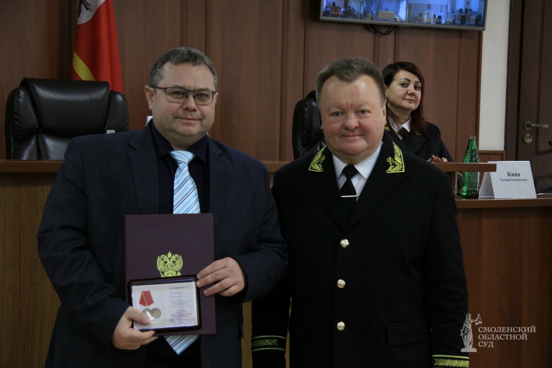 На итоговом совещании работников судебной системы Смоленской области состоялась торжественная церемония награждения наиболее отличившихся судей и сотрудников аппаратов судов. За большой личный вклад в развитие правосудия, высокие результаты в труде и многолетнюю безупречную службу отличившиеся сотрудники судебной системы были удостоены наград Смоленского областного суда и Совета судей Смоленской области. Награды вручали председатель Смоленского областного суда Евгений Шепелин и председатель Совета судей Смоленской области Антон Киселев. За отличие в служебной деятельности, высокие показатели в труде и личный вклад в развитие судебной системы юбилейной медалью «155 лет судебной системе Смоленской области» был награжден судья Ленинского районного суда города Смоленска в почетной отставке – Кудряшов Александр.