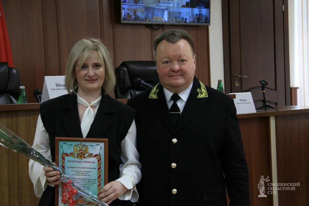 За многолетний добросовестный труд, высокий профессионализм и большой вклад в обеспечение судопроизводства Почетная грамота Смоленского областного суда вручена Кузнецовой Александре – занимавшей должность начальника отдела кодификации и судебной статистики Смоленского областного суда, в настоящее время судье Заднепровского районного суда города Смоленска.