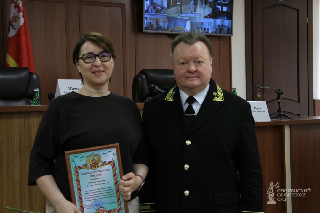 За профессиональное исполнение служебного долга и активное участие в мероприятиях, проводимых совместно с органами судейского сообщества, Благодарственное письмо председателя Смоленского областного суда вручено Ландаренковой Наталье – судье Смоленского областного суда.