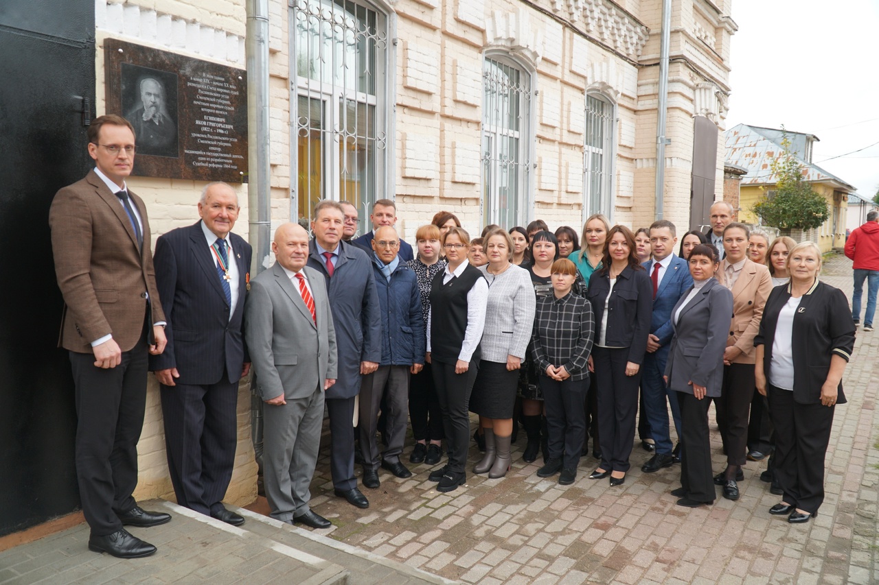 9 октября 2024 года в Рославльском городском суде Смоленской области состоялось торжественное мероприятие, посвященное открытию мемориальной доски, увековечивающей память, государственного деятеля Российской империи, талантливого российского юриста, сенатора, писателя, действительного тайного советника, кавалера ордена Святого апостола Андрея Первозванного, смолянина – Якова Григорьевича Есиповича. В мероприятии приняли участие: председатель Совета судей Смоленской области, заместитель председателя Смоленского областного суда А.С. Киселев, начальник Управления Судебного департамента в Смоленской области Д.В. Шутов, председатель Президиума совета ветеранов судейского сообщества Смоленской области Е.К. Волошин, председатель комиссии Совета судей Смоленской области, председатель Смоленского районного суда Смоленской области, О.А. Капустин, председатель Рославльского городского суда Смоленской области И.Н. Мясищев, первый заместитель главы муниципального образования «Рославльский район» Смоленской области В.В. Ильин, член Союза краеведов России М.В. Иванов.