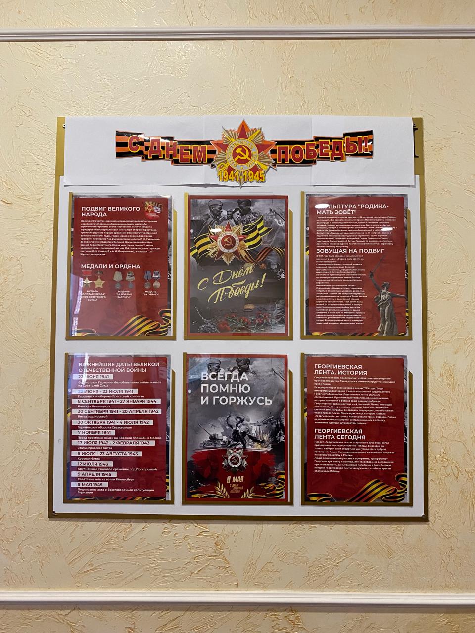 Также оформлен стенд, на котором размещена информация, посвященная теме войны 1941-1945 годов. На нем можно ознакомиться с важнейшими датами Великой Отечественной войны, об истории «георгиевской ленты», о создании мемориала «Родина-Мать зовет», познакомиться с медалями и орденами за подвиги великого народа.