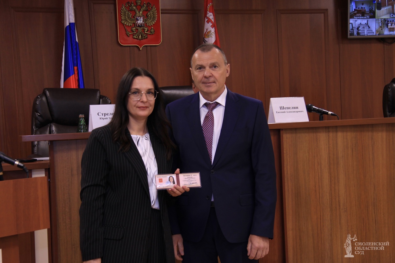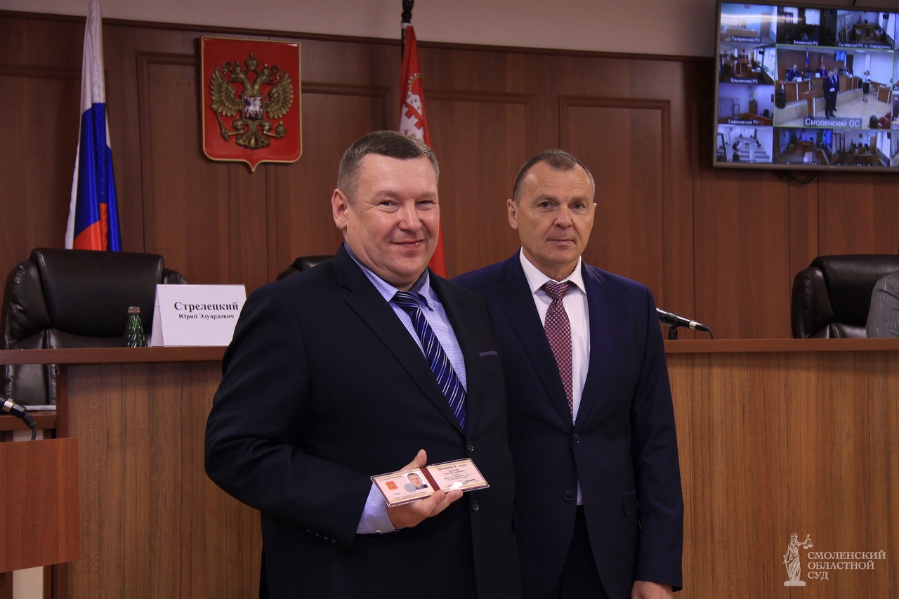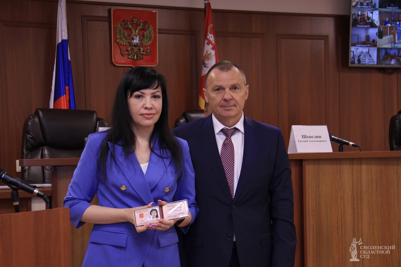 Указом Президента Российской Федерации от 17 апреля 2025 года № 244 в Смоленской области назначены федеральные судьи. Сегодня в Смоленском областном суде в ходе ежемесячного совещания с председателями районных (городских) судов области Главный федеральный инспектор по Смоленской области аппарата полномочного представителя Президента Российской Федерации в Центральном федеральном округе Стрелецкий Юрий Эдуардович вручил назначенным судьям служебные удостоверения: – судье Смоленского областного суда Величко Владлене Михайловне; – судье Вяземского районного суда Пугачеву Алексею Алексеевичу; – судье Заднепровского районного суда г. Смоленска Ковалевой Ирине Александровне; – судье Руднянского районного суда Бабенко Ирине Викторовне; – судье Сафоновского районного суда Васюковой Наталье Святославне.