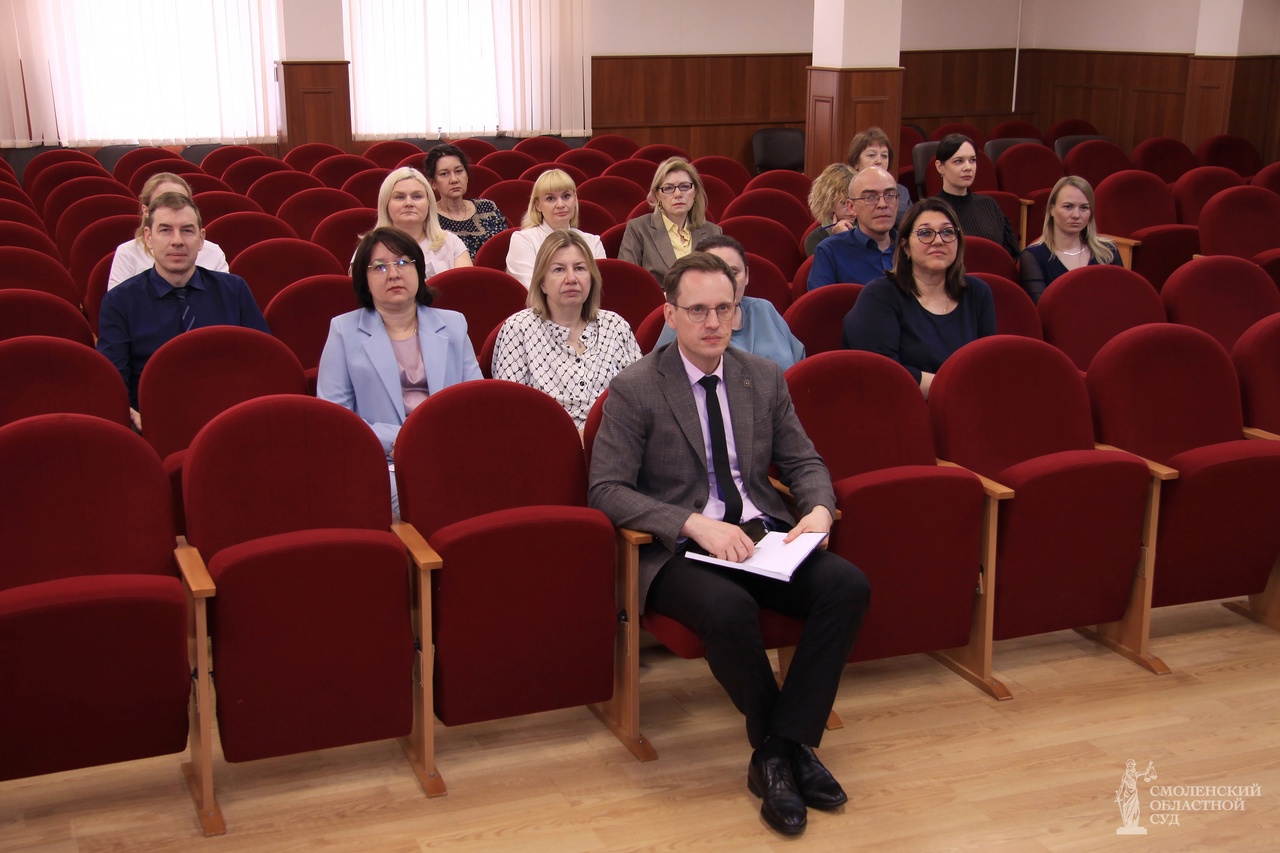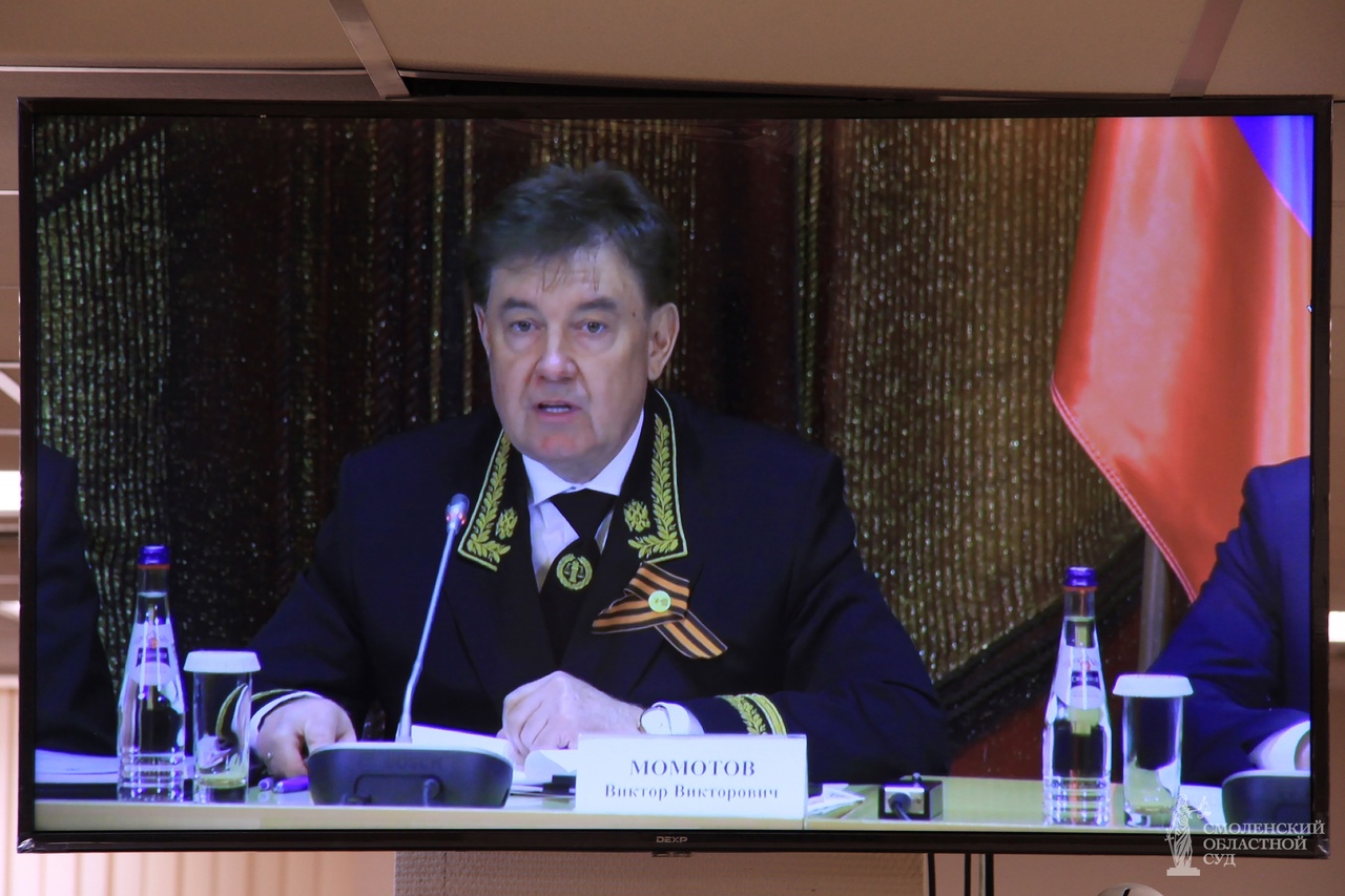 Судейское сообщество Смоленской области на пленарном заседании представляет председатель Смоленского областного суда, член Совета судей Российской Федерации и комиссии Совета судей Российской Федерации по связям с государственными органами, общественными организациями и средствами массовой информации Е.А. Шепелин. В зале Смоленского областного суда был организован просмотр трансляции открытия Пленарного заседания Совета судей Российской Федерации.
