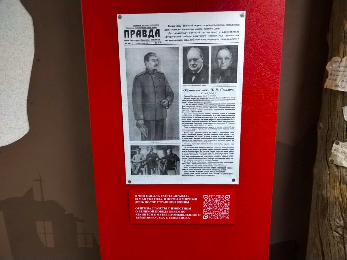 Оригинал газеты с известием о Великой Победе бережно хранится в музее Промышленного районного суда г. Смоленска, а с самим содержанием выпуска газеты можно ознакомиться при сканировании QR-кода, расположенного на экспозиции.