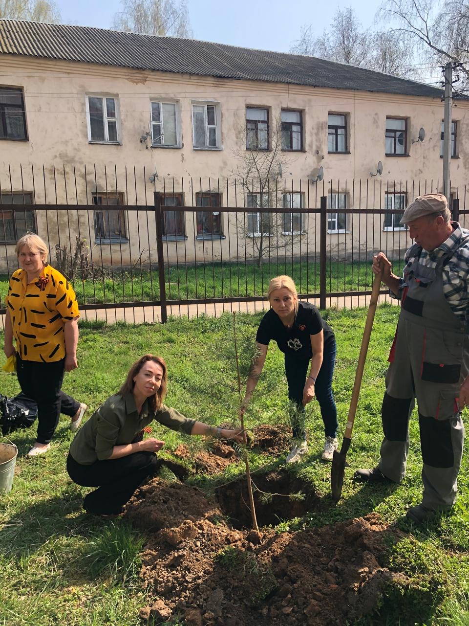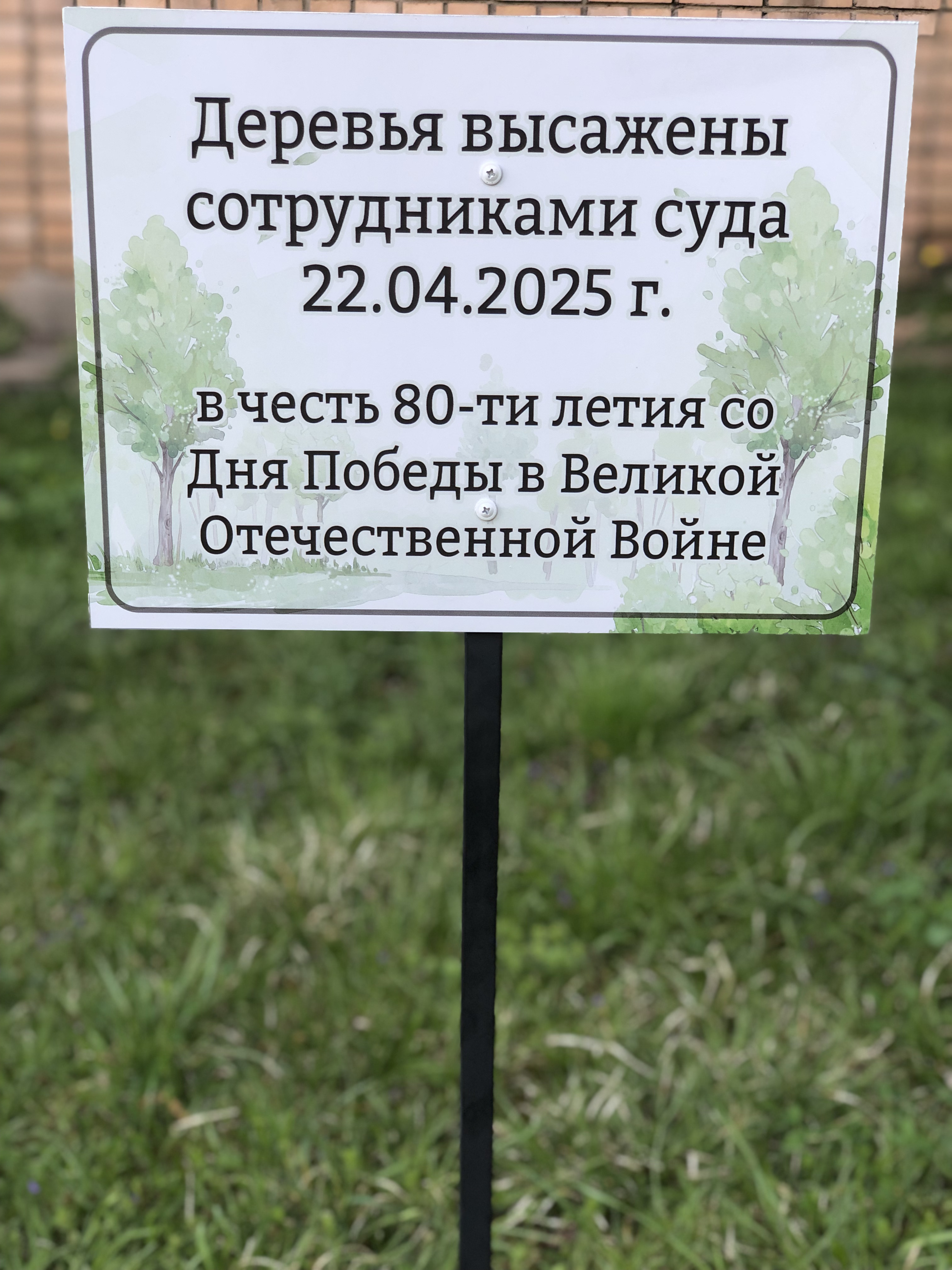 Возле здания суда в городе Сафоново коллективом высажены деревья и в честь Великой Победы к посаженным деревьям установлена памятная табличка.
